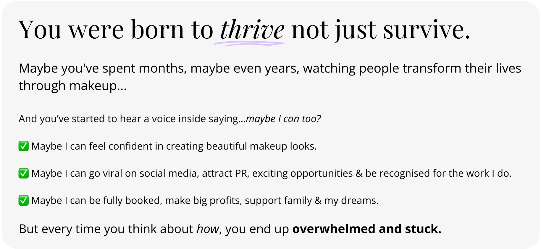 Created to help, aspiring to advanced, makeup artists go from feeling stagnant to becoming a thriving makeup artist attracting dream clients, recognition, opportunities & make big profits with ease from anywhere in the world.
